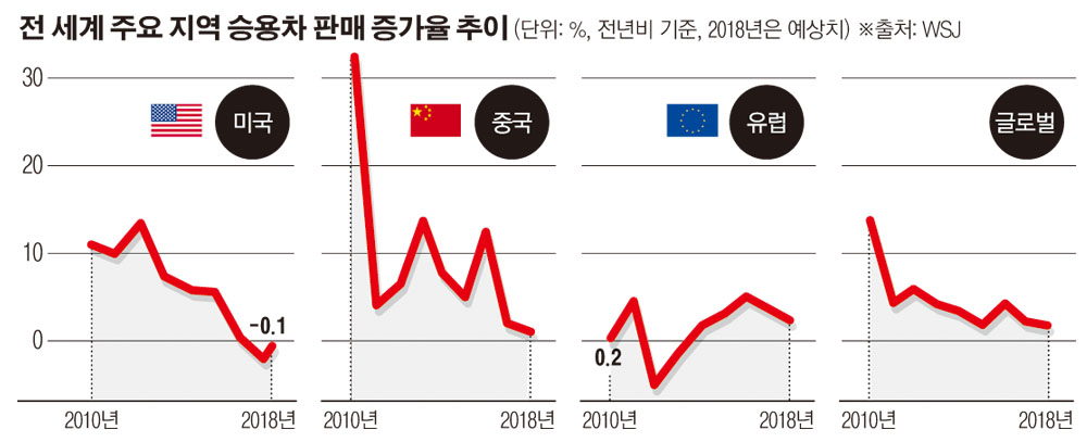 세계 자동차 산업이 미국발 무역전쟁의 희생양이 됐다. 10년 가까이 가파른 성장세를 구가해온 세계 자동차 시장의 신차 판매가 금융위기 이후 처음으로 지속적인 침체기에 접어들었다고 월스트리트저널(WSJ)이 28일(현지시간) 보도했다.
