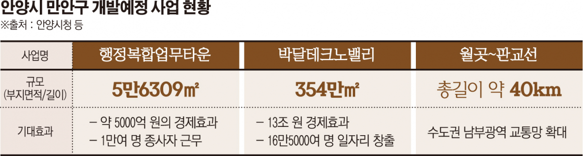 실제 안양시 만안구에는 대형 개발호재가 잇따르고 있다. 안양동에 자리한 옛 농림축산검역본부 부지를 행정업무복합타운으로 개발하는 사업이 대표적이다.