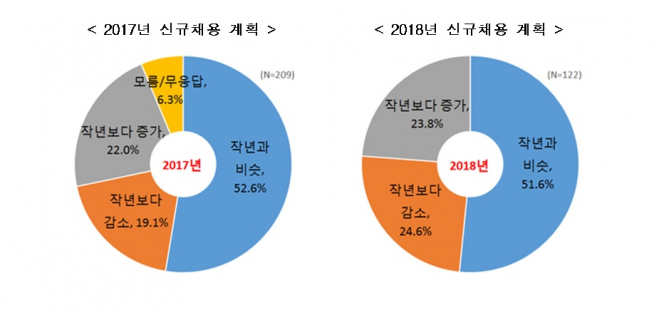신규채용을 줄인다고 응답한 기업들은 그 이유로 ‘국내외 경제 및 업종 경기상황 악화’(40.0%), ‘회사 내부 상황 어려움’(33.3%), ‘최저임금 인상 등 인건비 부담 증가’(16.7%), ‘비정규직의 정규직 전환으로 인해 신규채용 여력 감소’(3.3%) 등을 꼽았다.