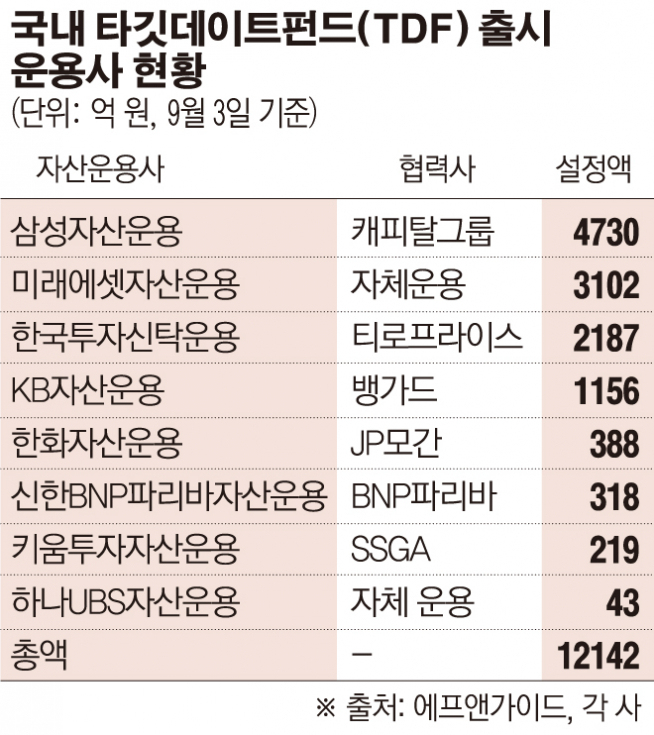 특히 국내 TDF 출시 8개 운용사 중 미래에셋자산운용과 하나UBS자산운용을 제외한 6곳(삼성·신한BNPP·키움투자·한국투자신탁·한화·KB)이 해외 운용사의 자문을 받거나 아예 운용을 위탁하고 있어 적용 기간을 유예해줄 것을 촉구해왔다. 이들 운용사는 높은 안정성을 추구하는 퇴직연금상품이란 점에서 외국계 대형 운용사와의 전략적 제휴를 선택했다. 다만, 전체 라인업의 주식 비중이 80% 이하인 삼성자산운용은 이번 사안에서 비교적 자유롭다.