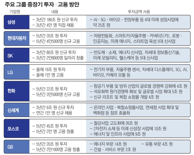 이런 분위기는 10대 그룹으로 전반으로 퍼졌다. 한화그룹은 앞으로 5년간 22조 원을 투자하고, 3만5000여 명의 일자리를 창출하겠다는 계획을 발표했다. GS그룹 역시 앞으로 5년간 20조 원을 투자하고 2만1000명의 고용을 창출하겠다고 했다. 신세계그룹도 앞으로 3년간 9조 원을 쏟아붓고 매년 1만 명씩 신규 채용에 나선다.