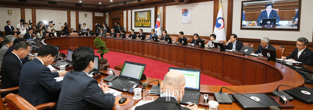 이낙연 국무총리가 4일 오전 서울 세종로 정부서울청사에서 '국무회의'를 주재하고 있다. 이날 국무회의에서 오는 10월 전역예정 병사부터 단계적으로 육군·해군·해병대는 3개월, 공군은 2개월 등 복무기간을 줄이는 '현역병 등의 복무기간 단축안'이 심의됐다. 또한, '5·18 민주화운동 진상규명을 위한 특별법 시행령 제정안'과 '군 사망사고 진상규명에 관한 특별법 시행령 제정안'도 각각 심의됐다. 오승현 기자 story@
