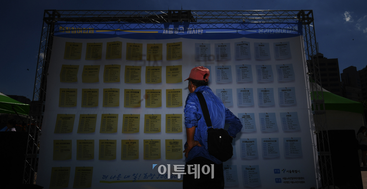 서울시가 노숙인, 쪽방 주민 등 취약계층을 대상으로 일자리 박람회를 개최했다. '제3회 취약계층 일자리 박람회'가 열린 4일 서울 중구 서울광장에서 취약계층 구직자들이 자신에 맞는 일자리를 찾고 있다. 60개 중소업체가 참가한 이번 박람회에서 취약계층 369명에게 경비, 미화, 기물 관리, 주방보조, 택배 배송, 방역소독 등의 업무를 수행할 기회가 주어졌다. 오승현 기자 story@