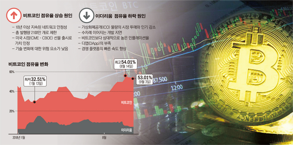 ◇이더리움 추락 이유는 = 비트코인 점유율 상승과 함께 시장의 관심을 끌고 있는 것은 이더리움의 가격 하락이다.