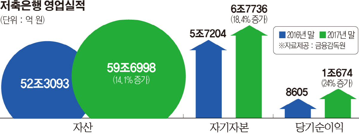 79개 저축은행 총자산은 약 64조 원으로 지난해 말보다 4조2000억 원(7%)이 증가했다. 이 가운데 대출금이 4조 원으로 자산 증가분의 대부분을 차지했다. 저축은행 대출금은 지난해 6월 말 47조2500억 원 규모였지만 올해 6월 말 기준으로 55조2100억 원을 기록했다. 1년 새 8조 원 가량 증가한 셈이다.