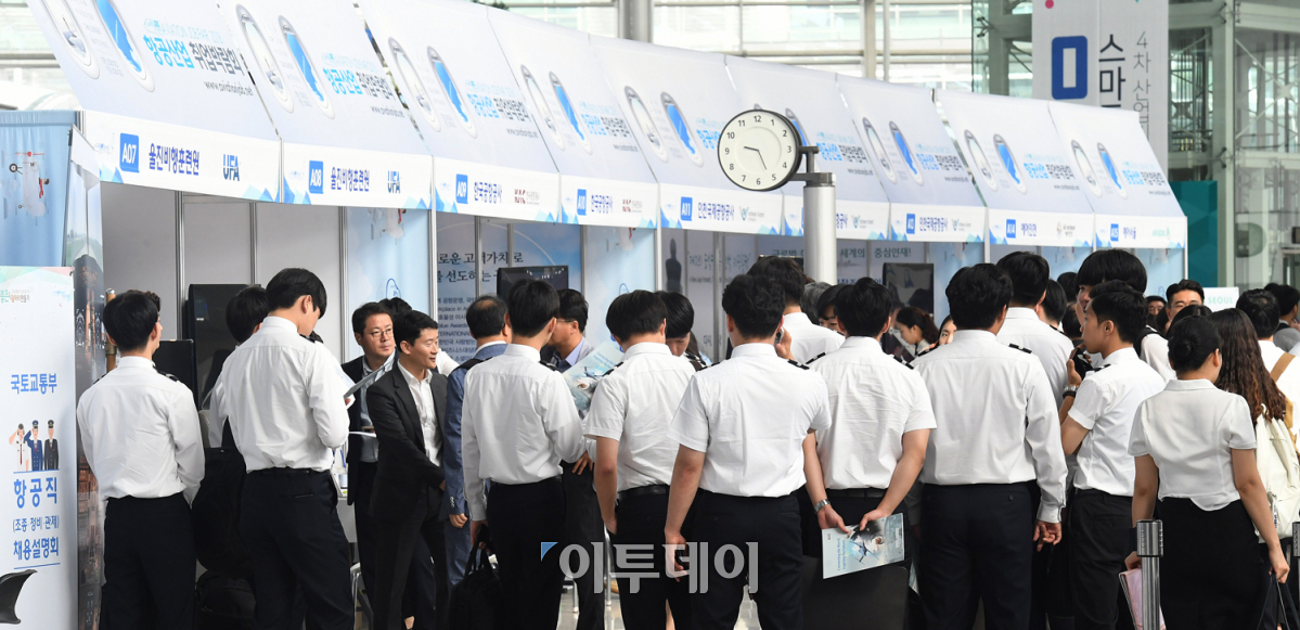 '제1회 항공산업 취업박람회'가 개막한 6일 오전 인천국제공항 제1여객터미널 교통센터에서 구직자들이 공항공사, 항공사, 항공기 제작사, 지상조업사 등 항공산업 분야의 일자리를 찾고 있다. 국내외 56개 항공 관련 기업과 공공기관, 연구기관이 참여한 이번 박람회는 국토교통부가 주최하고 인천공항공사, 한국공항공사, 한국항공협회가 주관했다. 오승현 기자 story@