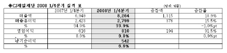 CJ제일제당는 8일 공시를 통해 2008년 1/4분기 매출이 전년 동기 대비 18.9%, 영업이익 31.5% 상승했다고 밝혔다.
