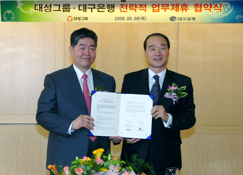 대구은행(은행장 이화언)과 대성그룹(회장 김영훈)이 8일 대구은행 본점에서 포괄적인 업무제휴 협약식을 가졌다.