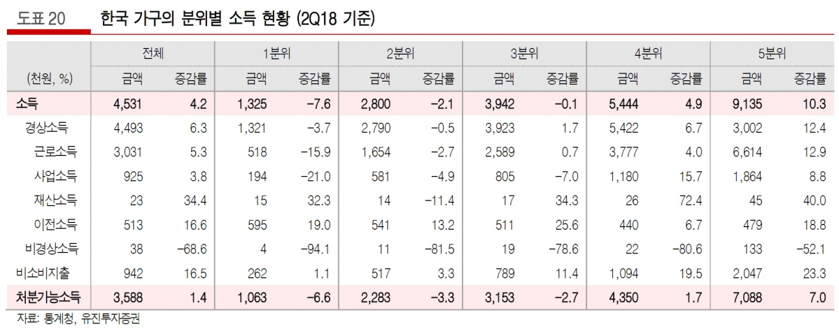 같은 기간 1분위 가구(최하위 20%)와 5분위 가구(최상위 20%)의 소득 격차는 크게 벌어졌다. 2분기 가구당 월평균 소득은 453만1000원으로 전년 동기대비 4.2% 증가했다.