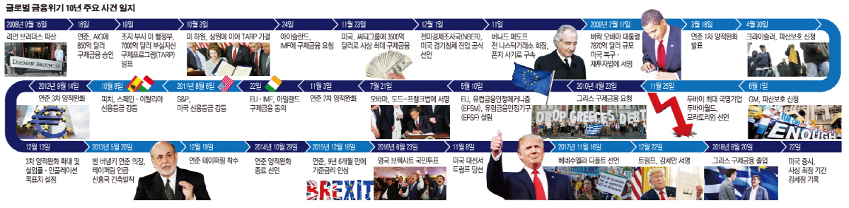 그러나 미국 국내총생산(GDP) 증가율은 40%에 못 미친다. GDP는 10년 전 14조8352억 달러(2008년 3분기)에서 20조4025억 달러(2018년 2분기)로 늘어나는 데 그쳤다. 실업률은 6.1%(2008년 9월)에서 3.9%(2018년 7월)로 완전 고용 수준으로 하락했다. 하지만 평균 시급 상승률은 0.6%에 불과하다. 세제 개혁 효과 덕에 눈앞의 경기는 개인소비를 중심으로 호조를 보이고 있지만 실업률 하락에도 불구하고 임금 성장은 둔화하는 한편 물가 상승 압력은 약한 상황이다. 주택 판매도 작년 가을께를 정점으로 부진하다. 주택 시황이 악화하면 팽창한 가계 채무 상환에 차질이 불가피하다. 미국 경기는 전후 최장 국면이지만 다시 금융위기가 촉발되기라도 하면 가계 부채가 뇌관이 될 수 있다. 가계 부채는 12조8600억 달러(2008년 3분기 기준)에서 올 2분기에는 13조2900억 달러로 금융 위기 때를 훌쩍 뛰어넘었다.