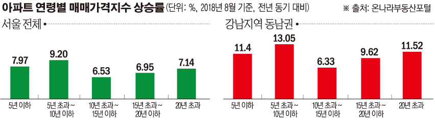 12일 온나라부동산포털의 아파트 연령별 매매가격지수 자료에 따르면 지난달 동남권(강동·송파·강남·서초)의 ‘5년 초과~10년 이하’ 매매가격지수는 110.9로 집계됐다. 이는 작년 8월(98.1)보다 13.05% 오른 수치다. 서울 전권역에서 가장 많이 올랐다.