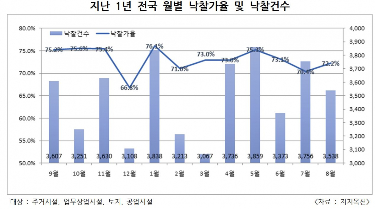 12일 지지옥션에 따르면 8월 전국 평균 낙찰가율은 72.2%로 전월대비 1.8%p 상승했다. 6월부터 하락한 낙찰가율은 지난달 70.4%로 올해 최저치를 기록했지만 8월 들어 회복했다.