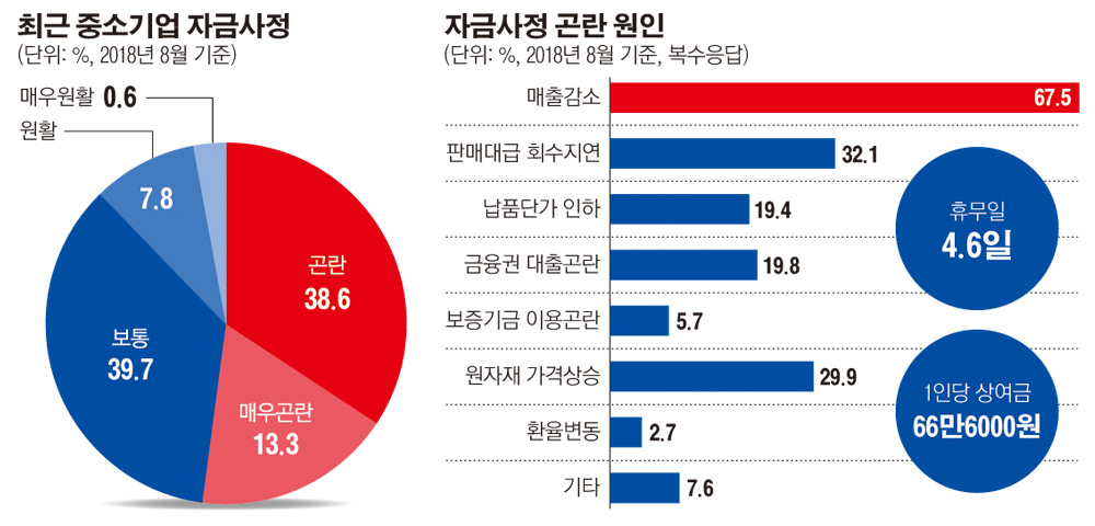자금 사정 곤란 원인(복수응답)으로는 내수 부진으로 인한 매출 감소가 67.5%로 가장 많았으며, 판매 대금 회수지연(32.1%), 원자재 가격 상승(29.9%)이 뒤를 이었다.
