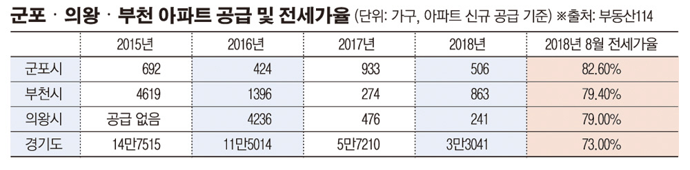 군포(82.6%)의 경우 80%가 넘고 있으며 부천(79.4%), 의왕(79.0%)도 80%에 육박하고 있다. 이 기간 경기도 평균은 73.0%으로 세 지역이 경기도 전세가 비율을 견인하고 있는 모습이다.