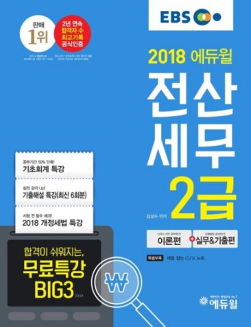 ‘2018 EBS 전산세무 2급’ 교재는 ‘2018 EBS 에듀윌 전산세무 1급’ 교재와 같은 시리즈로, 교재를 구입하면 EBS 강의를 들을 수 있으며, 회계 원리의 기초용어부터 문제풀이까지 30강으로 끝낼 수 있는 기초회계특강, 최신기출문제 6회분 기출해설 특강, 시험 2주 전 막판 스퍼트를 돕는 파이널특강 등을 무료로 수강할 수 있는 혜택이 주어진다.