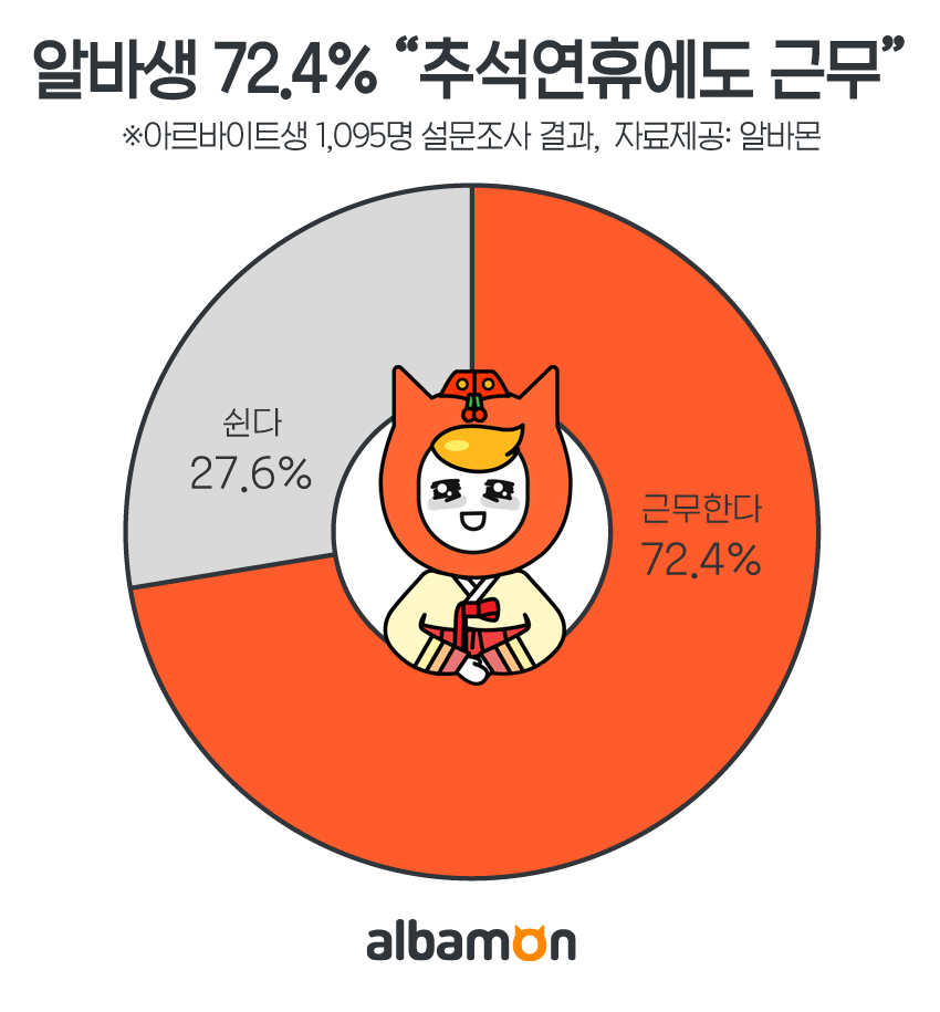 알바몬 조사 결과 현재 아르바이트를 하고 있는 알바생 중 올해 추석 연휴 기간에 정상근무를 한다는 답변이 72.4%에 달했다.