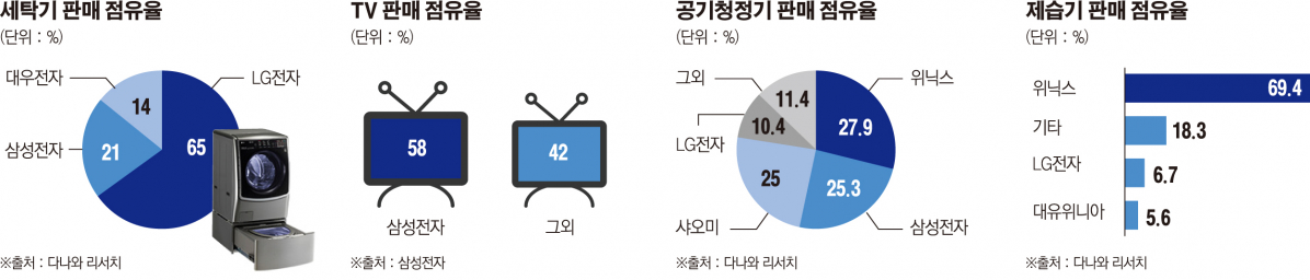 제습기, 공기청정기와 같은 계절가전에선 강소기업인 위닉스가 선전을 거두고 있다. 다나와 리서치가 발표한 5월 제습기 시장 점유율(판매량 기준) 조사에서 위닉스가 1위(69.4%)를 차지했다. 같은 기간 이뤄진 공기청정기 조사에서도 위닉스가 삼성을 제치고 선두(27.9%)에 올랐다.