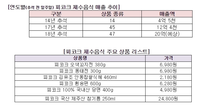 이번 추석의 경우 최대 10일까지로 휴무가 길었던 작년과 비교해 연휴기간이 짧고, 차례를 주로 준비하는 중장년층 고객은 물론 젊은 고객들에게도 간편 제수음식에 대한 선호가 높아지면서, 올해 추석 피코크 제수음식 매출은 작년 대비 약 61% 늘어난 20억 수준으로 예상된다.