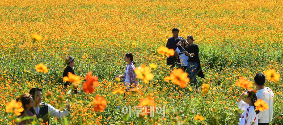 추석 연휴 마지막 날인 26일 시민들이 경기도 남양주시 물의정원에서 만개한 황화코스모스를 관람하며 깊어가는 가을을 즐기고 있다. 오승현 기자 story@