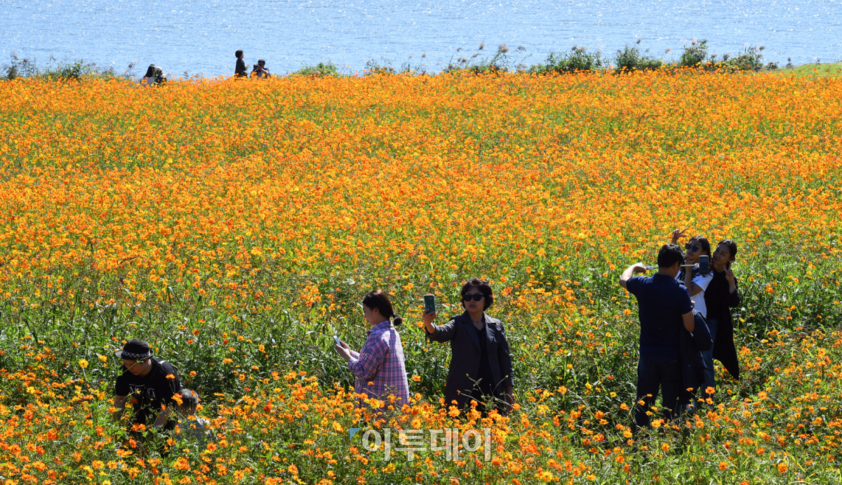 추석 연휴 마지막 날인 26일 시민들이 경기도 남양주시 물의정원에서 만개한 황화코스모스를 관람하며 깊어가는 가을을 즐기고 있다. 오승현 기자 story@