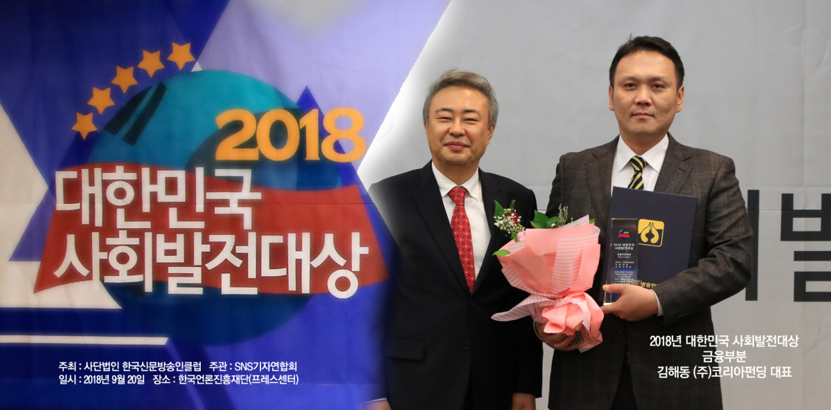 ‘P2P금융, 그 이상!’을 목표로 하는 코리아펀딩은 지난 20일 한국신문방송인클럽과 한국 SNS기자 연합회에서 주최하는 ‘2018 대한민국 사회 발전대상’에서 금융 부문 대상을 차지 했다고 27일 밝혔다.