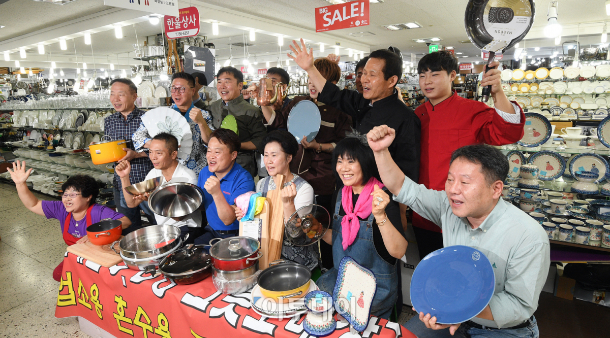 '2018 가을 주방용품대전'이 개막한 27일 서울 중구 남대문시장 그릇도매상가에서 상인들이 "경기야 살아나라"라 외치며 행사를 홍보하고 있다. 주방·조리용품 및 혼수 그릇세트 등 1만여 상품을 한곳에서 볼 수 있는 이번 행사는 다음 달 13일까지 이어진다. 오승현 기자 story@