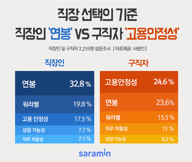 구인구직 매칭 플랫폼 사람인이 직장인 및 구직자 2259명을 대상으로 ‘직장선택의 기준’에 대해 조사한 결과를 1일 발표했다.