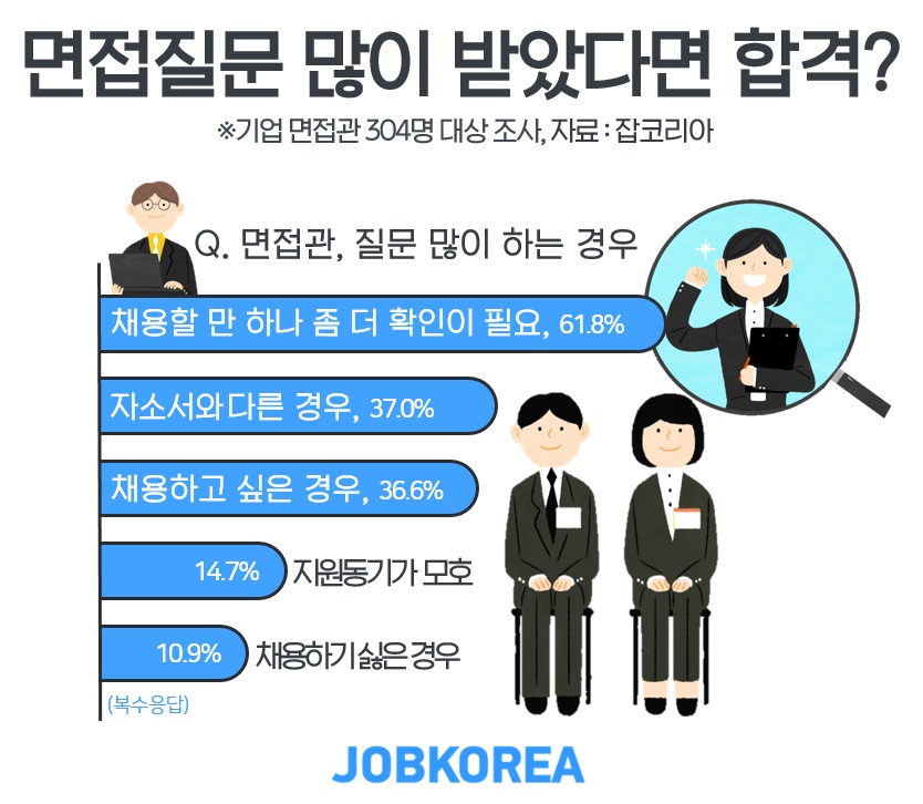 또 면접관들에게 “면접 중 어떤 지원자에게 질문을 더 많이 하는지”를 물은 결과 “채용할 만 하나 조금 더 확인하고 싶은 지원자”가 응답률 61.8%로 가장 많았다. 이외에 “자기소개서에 쓰인 내용과 면접장에서 말하는 내용이 다른 지원자(37.0%)”, “채용하면 좋겠다고 생각되는 지원자(36.6%)”, “왜 지원했는지 입사동기가 모호한 지원자(14.7%)”, “채용하고 싶지 않은 지원자(10.9%)” 순으로 조사됐다.