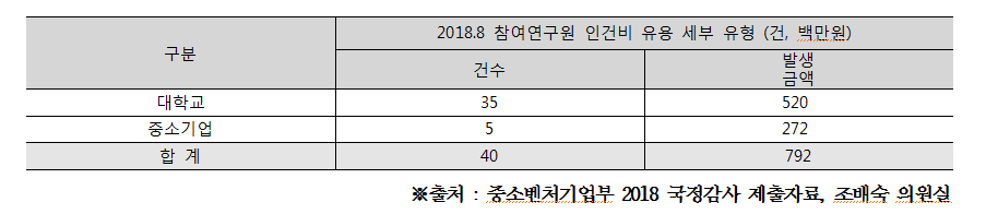 특히, 여러 불법 유형 중에 참여연구원 인건비 유용 건수는 2017년 8건 이었던 것이 올해 40건으로 5배 급증했다. 40건 중 대학교 35건, 중소기업 5건으로 대학교에서 연구개발에 참여한 학생들의 인건비 유용이 심각한 상황이다.