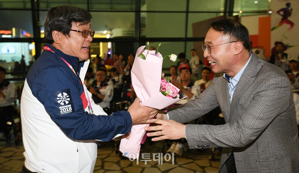 '2018 인도네시아 장애인아시아경기대회' 대한민국 선수단이 2일 오후(현지시각) 인도네시아 자카르타 수카르노하타국제공항에 도착, 전민식(왼쪽) 단장이 김종민 인도네시아 총영사에게 꽃다발을 받고 있다. 대한민국 선수단은 종합성적 3위를 목표로 17개 종목에 참가해 열전을 벌인다. <20181002 자카르타=사진공동취재단 이투데이 오승현기자>
