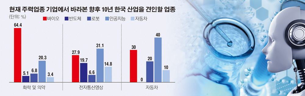화학 및 의약 관련 기업은 향후 10년 한국 산업을 견인할 업종으로 자신이 속한 ‘바이오’라고 응답한 비중이 64.4%로 가장 높았다. 이어 인공지능(20.3%), 로봇(6.8%), 반도체(5.1%), 자동차(3.4%) 순이었다.
