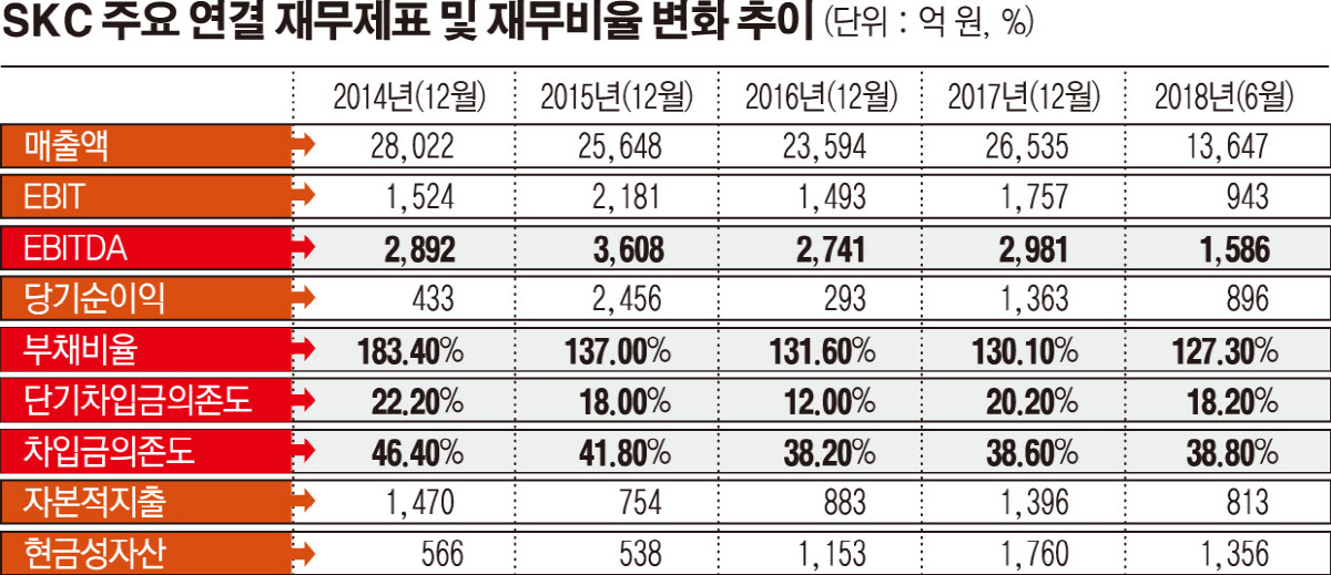 5일 금융투자 업계 및 신용평가 기관에 따르면 SKC의 법인세·이자·감가상각비 차감 전 영업이익(EBITDA)은 최근 5년(2013~2017년) 평균 약 2900억 원으로 집계됐다. EBITDA는 기업의 현금창출 능력을 나타낸다. 외부 자금 조달 없이 내부 투자 등에 연간 2900억 원을 투입할 수 있다는 의미다.