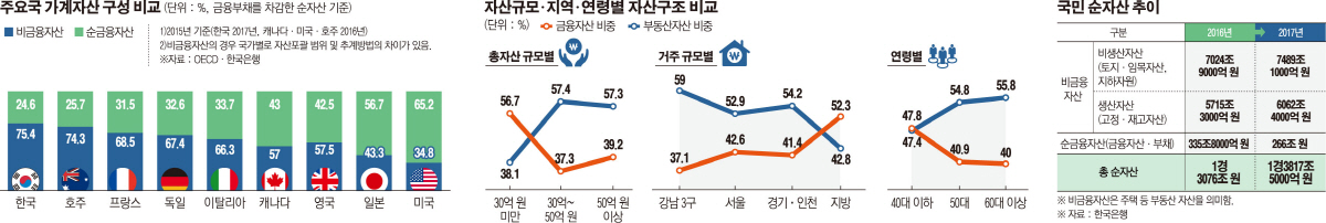 ◇韓 부동산 쏠림, 美의 ‘2배’= 한국의 부동산 몰빵은 숫자로 증명된다. 한국은행의 ‘2017년 국민대차대조표’에 따르면 국민 순자산(자산-부채)은 1경3817조5000억 원에 달한다. 가구당 재산으로 따져보면 3억8867만 원이다. 이 가운데 75.4%(2억9380만 원)가 토지ㆍ건물 등 부동산에 쏠려 있다. 글로벌 금융위기 이후 꾸준히 줄고 있지만, 여전히 프랑스(68.5%), 독일(67.4%), 일본(43.3%), 미국(34.8%) 등 주요 선진국보다 높다. 소위 부자로 불리는 금융자산 5억 원 이상 가진 사람들도 별반 다르지 않다.