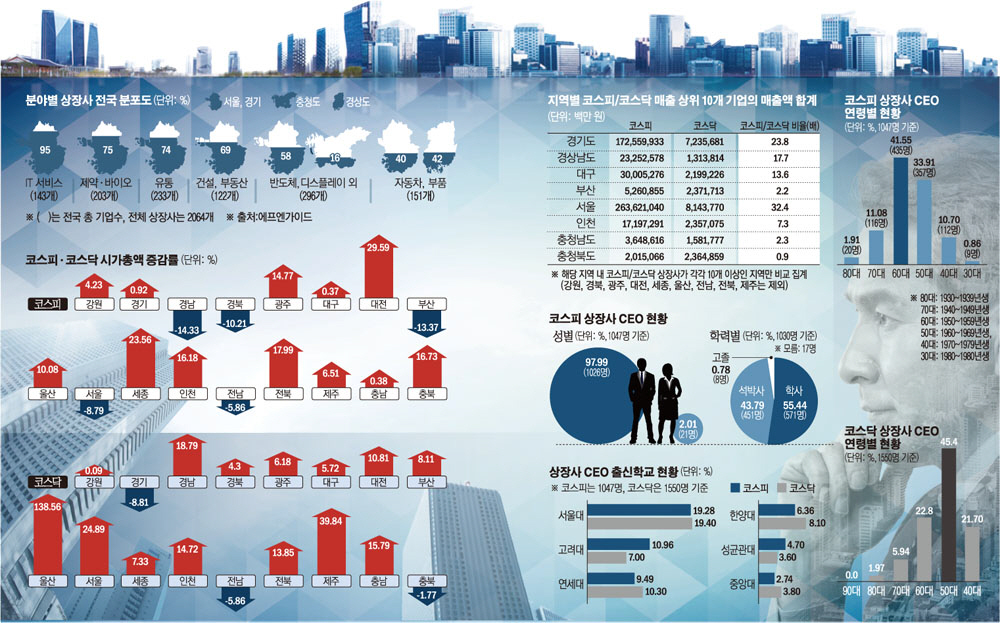 학력은 코스피가 코스닥에 비해 높은 것으로 나타났다. 대학교를 졸업한 학사 비중은 코스피가 55.44%, 코스닥은 48.8%다. 석·박사는 코스피 43.79%, 코스닥 37.9%다. 코스피에서 고졸 CEO 비중은 0.78%에 그친 반면 코스닥에서는 1.9%로 상대적으로 많았다. 반면 여성 CEO 비중은 코스닥이 코스피를 앞섰다. 코스닥 상장법인의 여성 대표이사는 총 43명(2.77%)이었고 코스피는 21명(2.01%)이다. 대학별로 살펴보면 코스닥은 서울대(19.4%), 연세대(10.3%), 한양대(8.1%), 고려대(7.0%), 중앙대(3.8%), 성균관대(3.6%)의 순이었고, 코스피는 서울대(19.28%), 고려대(10.96%), 지방 국공립(9.59%), 연세대(9.49%) 순이다.