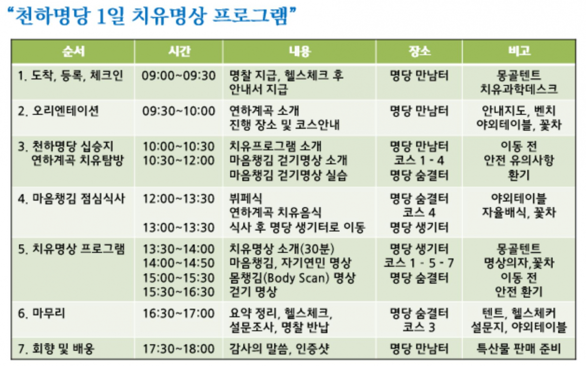 이번 연하계곡 명당마을 심신치유 프로그램은 천하명당의 숲과 계곡에서 마음챙김 자애 명상, 걷기명상, 마음챙김 치유음식 식사 등으로 구성된 1일 프로그램으로 진행될 예정이다.