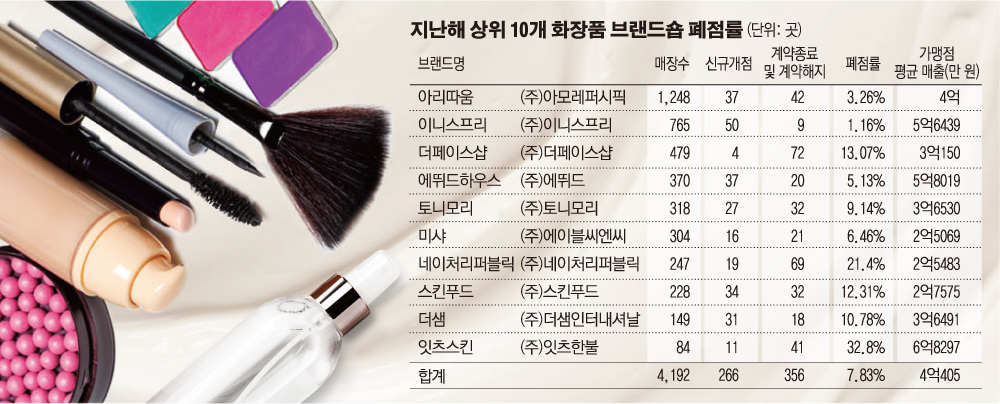 7일 공정거래위원회에 등록된 정보공개서에 따르면 지난해 한 해 동안 폐점한 브랜드숍은 상위 10개사 기준 356개에 달했다. 같은 기간 신규 출점은 266개에 불과했다.
