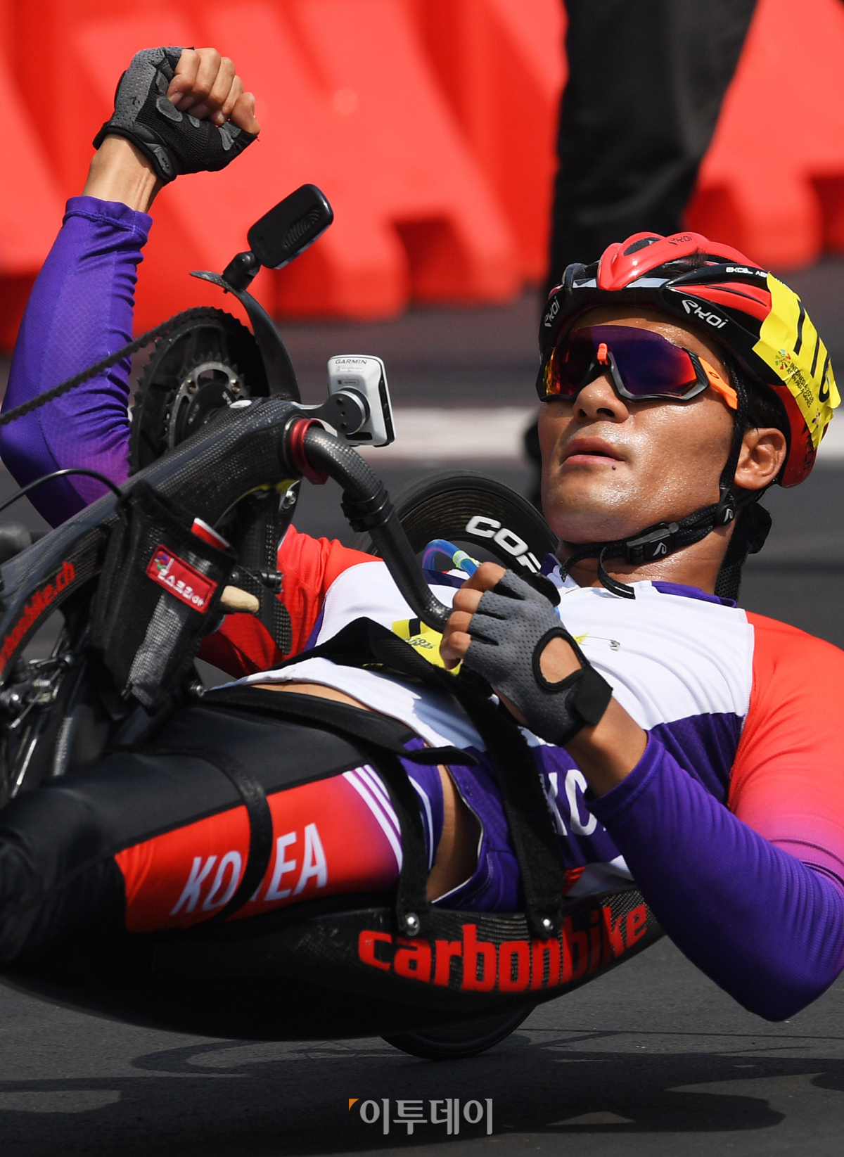 윤여근이 9일 오전(현지시간) 인도네시아 자와바랏 보고르 센툴국제서킷에서 열린 '2018 인도네시아 장애인아시아경기대회' 핸드사이클 남자 개인 로드레이스 독주(H4-5·48km) 결선에서 1위로 결승선을 통과하며 환호하고 있다. <20181009 보고르=사진공동취재단 이투데이 오승현기자>