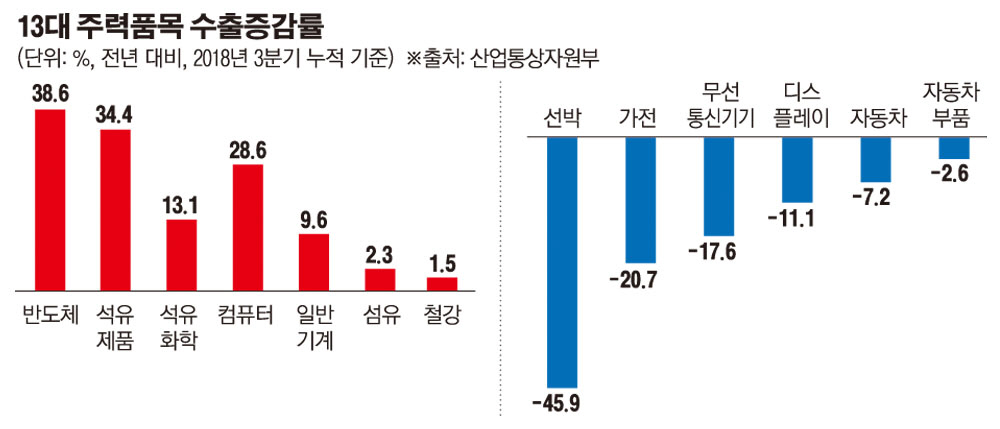 이처럼 13대 주력 품목 가운데 6개 품목이 수출 감소세를 보인 것은 반도체에 의존하는 우리 수출 구조의 취약성을 단적으로 보여 주고 있다. 만에 하나 반도체 수출마저 삐걱거린다면 우리 수출이 한순간에 바닥으로 곤두박질칠 수 있다는 의미다.