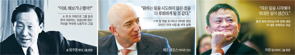 한국뿐 아니라 세계 경제는 이런 개척자들의 줄 잇는 등장으로 발전해왔다. 미국의 실리콘밸리는 실패의 무덤이자 창업의 요새다. 아마존 창업자인 제프 베조스는 “실패하더라도 안정에 집착하다가 원하는 일을 시도하지 않은 것을 더 후회하게 될 것 같다”며 100만 달러(약 11억 원) 연봉의 직장을 버리고 나와 아마존을 만들었다. 세계 최고 부호인 베조스이지만, 22년간 70개 사업 중 18개를 ‘말아먹었다’. 우버 창업자인 트래비스 캘러닉도 네 번의 큰 좌절과 파산을 딛고 우뚝 섰다.