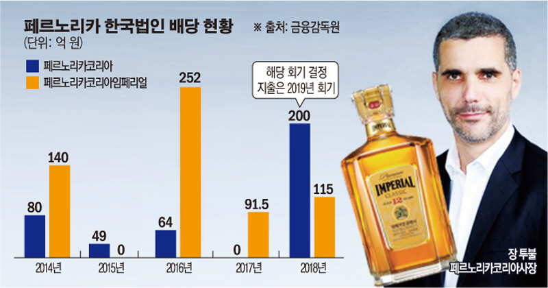 이러한 상황에서도 두 회사 모두 수백억 원을 해외에 배당하고 있다. 페르노리카코리아는 이번 회기에 200억 원의 배당을 결정했다. 같은 기간 거둔 순이익 171억 원을 훌쩍 넘는 규모로 배당성향은 116.9%에 달한다. 이 회사는 또 모회사와 페르노리카 관계회사 등을 대상으로 일반관리비와 광고선전비, 원료매입 등으로 261억 원을 지급하기도 했다.