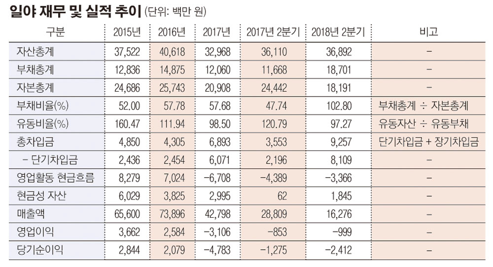 실제 일야의 2015·2016·2017년 매출액은 각각 651억 원, 732억 원, 426억 원이다. 2017년을 기점으로 감소 추세가 확연하다. 올해 상반기 매출액도 전년 대비 43.50% 줄어든 162억 원을 기록했다.