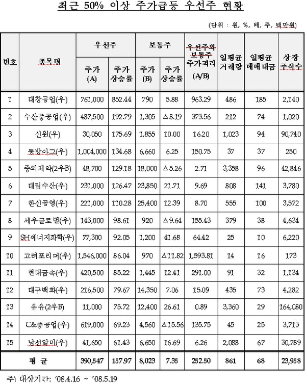 거래소에 따르면 최근 1개월간 50% 이상 주가가 급등한 32개 종목 중 우선주가 15개로 대부분을 차지하며 이들 종목의 주가추이를 분석한 결과, 동 우선주의 평균 주가상승률은 158%로서 보통주의 상승률 7.4%를 훨씬 초과하는 이상급등 현상을 보이고 있었다.