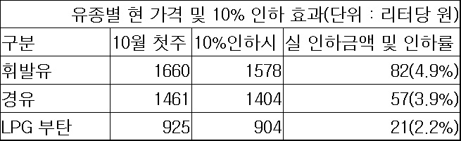 유류세 10% 인하 시 10월 첫째주 가격을 기준으로 리터당 휘발유는 82원, 경유 57원, LPG 부탄은 21원 각각 내려(부가가치세 10% 포함)간다.