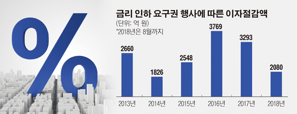 금감원에 따르면 금리 인하 요구권 행사에 따른 이자 절감액은 2013년 이후 현재까지 1조6176억 원에 달한다. 올해는 1~8월간 이자 절감액이 2080억 원에 달했다.