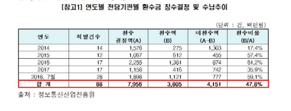 한편 환수결정액 중 실제로 돌려받은 환수액은 절반에 미치지도 못하는 것으로 밝혀져 NIPA의 무능도 함께 지적됐다. 5년간 환수 결정액 79억 중 미환수액은 41.5억으로 환수율은 47.8%에 그쳤다.