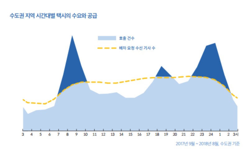 리포트에 따르면 출근 시간대인 오전 7~10시, 퇴근 시간대인 오후 6~10시, 심야시간인 오후 10시~새벽 2시에는 택시 공급 부족 현상이 심각했다. 또 폭염이나 혹한, 폭우 등으로 기상상황이 악화됐을 때 승객 수는 늘어나는데 반해 택시 기사들은 오히려 운행을 꺼리는 것으로 조사됐다.