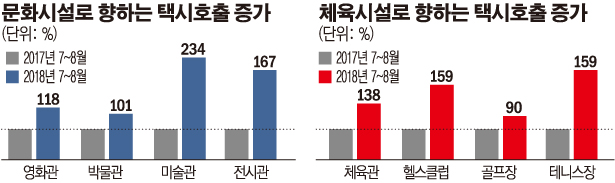주 52시간 시행 이후 택시 호출 시간도 빨라지고 있는 것으로 나타났다. 특히 문화·체육 시설로 향하는 이동은 전 분야에 걸쳐서 큰 증가를 보였다. 영화관으로 향하는 호출은 전년 동기 대비 118%, 박물관은 101%, 미술관은 234%, 전시관은 167% 증가했고, 체육관 138%, 헬스클럽 159%, 골프장 90%, 테니스장 159% 등으로의 이동도 큰 폭으로 확대됐다.