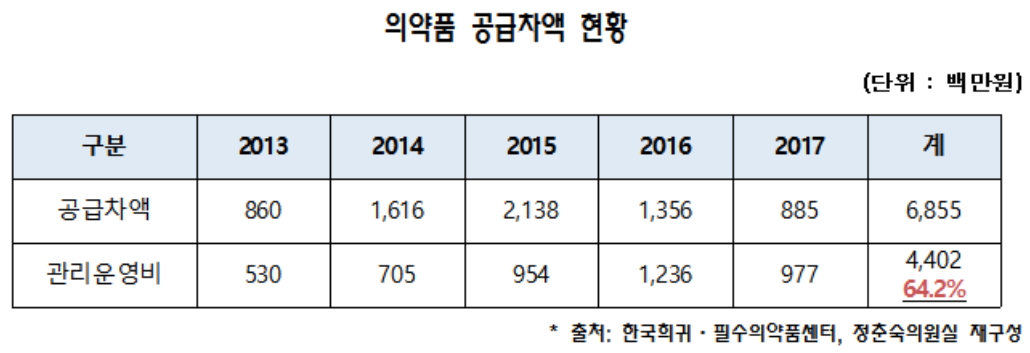 국회 보건복지위원회 소속 정춘숙 더불어민주당 국회의원이 한국희귀·필수의약품센터로부터 제출받은 자료를 분석한 결과, 센터는 지난 5년 간 의약품 공급차액으로 발생한 68억5500만 원 중 44억200만 원(64.2%)을 관리운영비로 사용한 것으로 나타났다. 공급차액은 희귀질환자 등으로부터 받은 약값 중 환차익과 대량구매 할인 등으로 발생하는 금액이다.