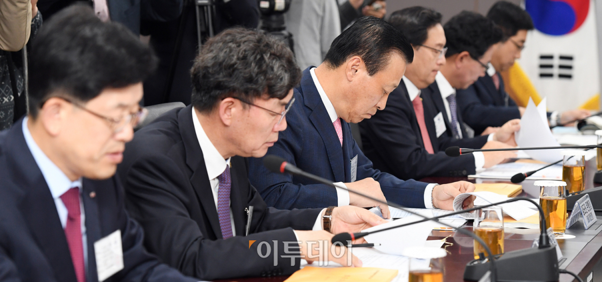 17일 오전 서울 세종로 정부서울청사 금융위원회 대회의실에서 열린 '동산금융 활성화를 위한 은행장 간담회'에 참석한 은행장들이 최종구 금융위원장의 모두발언을 경청하고 있다. 이날 간담회에 참석한 6개 대형은행 및 3개 지방은행 행장들은 은행 간 우수사례 공유를 통해 본격적인 동산금융의 활성화 계기를 마련했다. 오승현 기자 story@