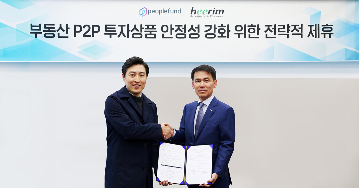 테크기반 대체투자 금융플랫폼 피플펀드가 글로벌 건축설계 및 CMㆍ감리업체 희림과 부동산 P2P투자상품 관리감독 역량 극대화를 위한 전략적 제휴를 체결했다고 18일 밝혔다.
